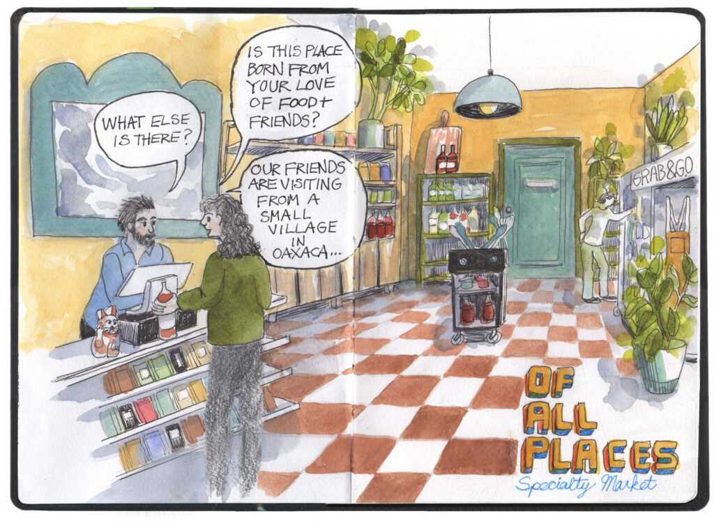 Of All Places is a specialty food and wine shop located at 1841 Solano Avenue in Berkeley. You can find some of the wines and olive oils covered in this issue as you discover all kinds of delicious items for your next gathering. From the sketchbook of Cathy Raingarden: @cathyraingarden and cathyraingarden.com.