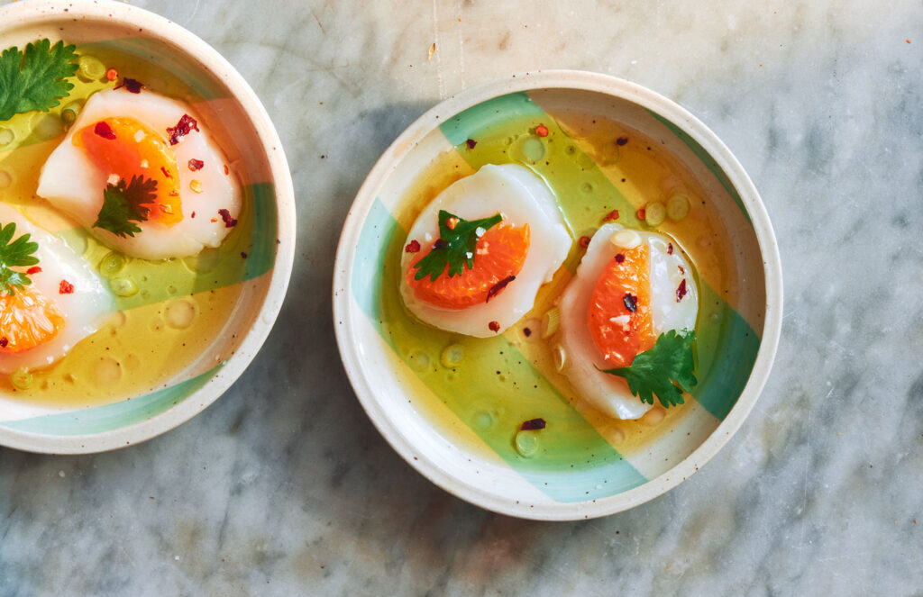 Using a very sharp knife, cut scallops into 2 or 3 ½-inch-thick silver dollar–shaped slices. Peel and supreme the mandarins. Arrange the slices of scallop on the chilled serving plates, then place 1 piece of mandarin on each. Garnish the crudo with cilantro leaves, flaky salt, and chili flakes. Finish with a generous drizzle of lime oil so the fish is sitting in a shallow green pool. Finally, squeeze fresh lime juice over the entire plate. Serve immediately.