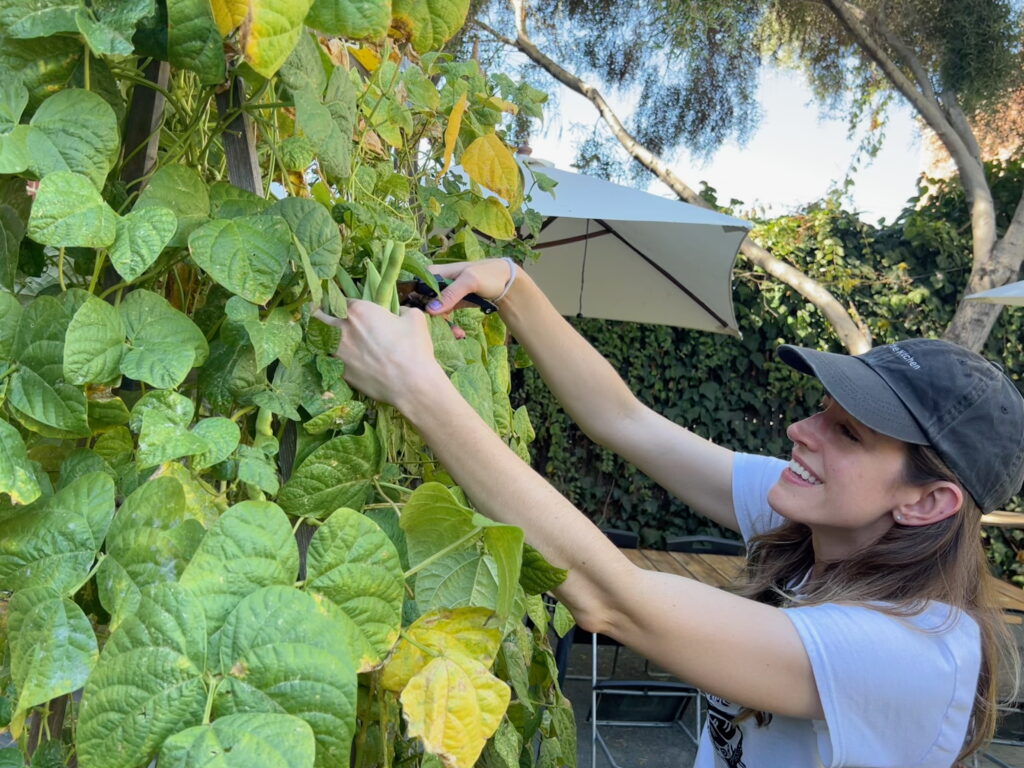 Temescal Open Edible Gardens organizer Kelly Cannon harvests romano beans in her home garden.