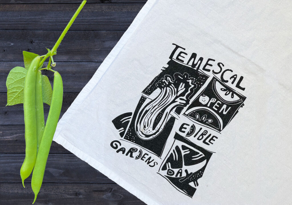 The Temescal Open Edible Gardens logo was created by artist Kathleen Miller. At the 2025 event, the logo was silk screened onto tea towels as gifts for volunteers.