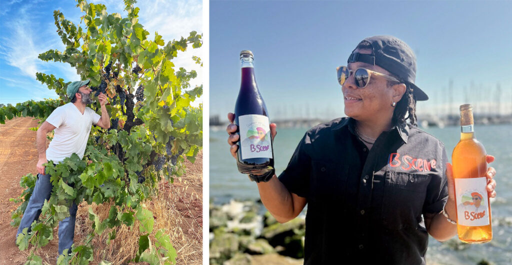 Hovik Winemaker John Semerdjian inspects old vine carignan vines in Redwood Valley, Mendocino County (courtesy: Hovik). BScene winemaker Bibi Adams on the Richmond waterfront with her Cabernet My Way and Mal–va–si–“ya”–Later! wines (courtesy: BScene).