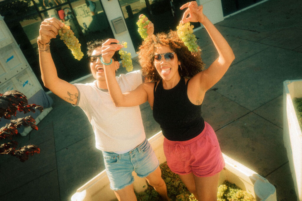 Laughing Gems’ Tiffani Patton and Jonathan Yang stomp orange muscat grapes. (photo: Jeremy Chiu)