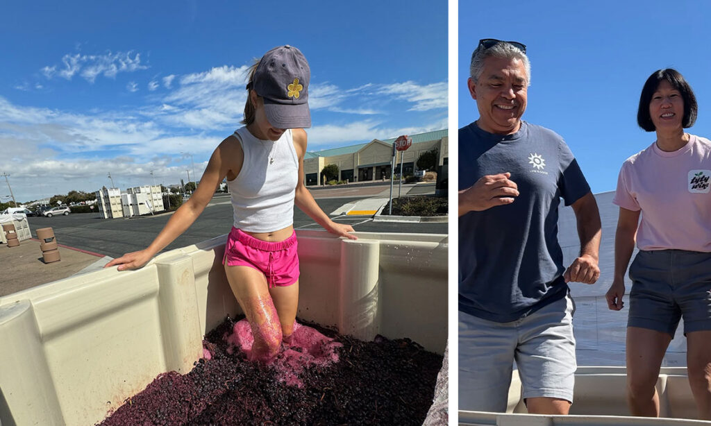 Megan Sekermestrovich stomps valdiguié grapes (photo: Jeremy Chiu). Right:Purity Wine’s Noel Diaz and Barrie Quan stomp some malvasia. (photo: Kathleen McKeeveny)
