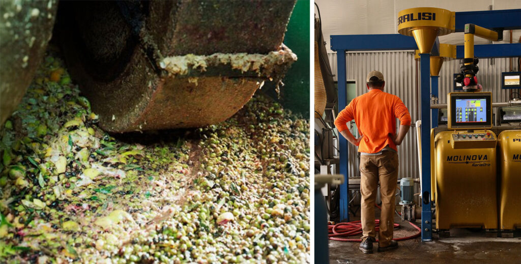 Left: When the Ricci family invented their AUGRUMATO co-milled olive oils in 1989, they were still reliant on old technology like this stone mill crushing their citrus and olives. (Courtesy AGRUMATO) Right: Milling has become more prosaic with ultra-modern equipment like this Pieralisi system at 43 Ranch seen here processing Fisher’s Like Family Olive oils. (Photo by Evan Loewy, Like Family)