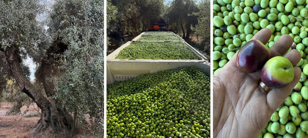 The tree at left in Olivaia’s Block X dates back to a century to when Lindsay area was the table olive capital of the state. Now renovated for olive oil production, Block X produces a pungent olive oil that Zavolta was skeptical of using for their co-milling experiments. Instead they’re going with the delicate oil they get from their huge Sevillano olives. (Photos by Giuliano Zavolta, Olivaia/OLA)