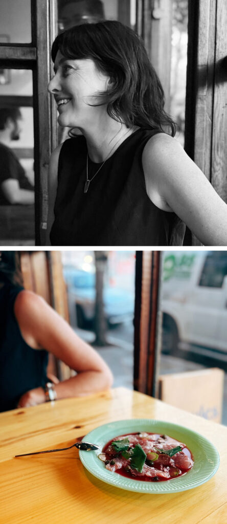 Jules Pizza Co. is one of the places where Dani Fisher (above) likes to test out her Like Family co-milled oils. The dish of Chef Max Blachman-Gentile’s crudo (below) is seasoned with Like Family’s Il Lime oil. (Photos by Annie Svigals)