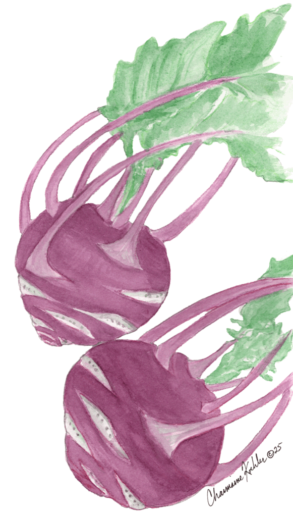 Pale-green kohlrabi is most prevalent in our markets, but a more colorful purple variety with a similar taste has been popping up. Stems and leaves are often trimmed off before kohlrabi gets to the market, but I’m now finding untrimmed bulbs tied together in bunches like beets.