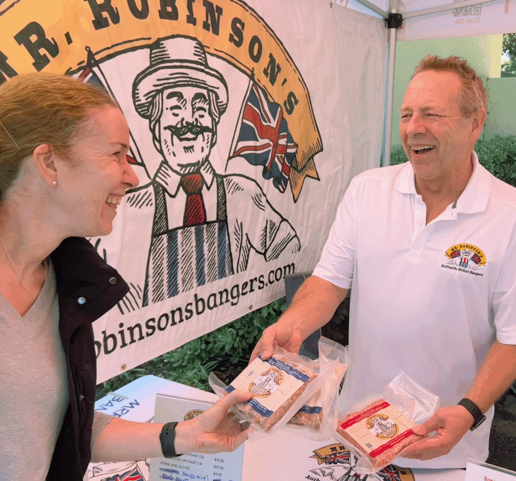 An hour before closing time at the Diablo Valley Farmers’ Market, the sausages and savory pastries at Mr. Robinson’s Authentic British Bangers are selling out fast. Mr. Robinson—first name David—and his wife, Alison, are serving a long line of customers at their booth, which is decked out with British flags and a logo of a classic British butcher. Shoppers are eager for samples and hoping to buy their favorites before everything is gone. The couple started by selling online only, but when they brought their wares to the farmers’ market in June 2025, things clicked. “We’ve seen a massive uptick in our revenue,” says Mr. Robinson.