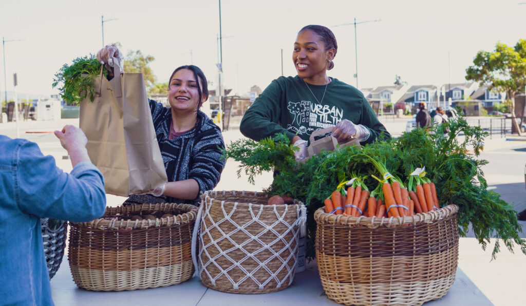 HEAL team members Bailey and Aracely distribute produce to community members at the opening of the Richmond Rising Community Hub.