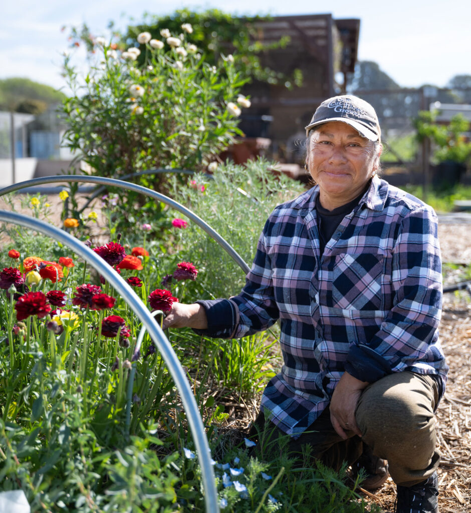 Urban Tilth Greenhouse Manager Maria Hernandez tends a flower bed next to her greenhouses