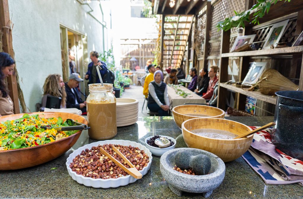 Typical evening fare at Café Ohlone might include venison albondigas (meatballs) with dandelion greens, chia pudding, acorn soup, roasted hazelnuts, Ohlone salad, and acorn brownies.