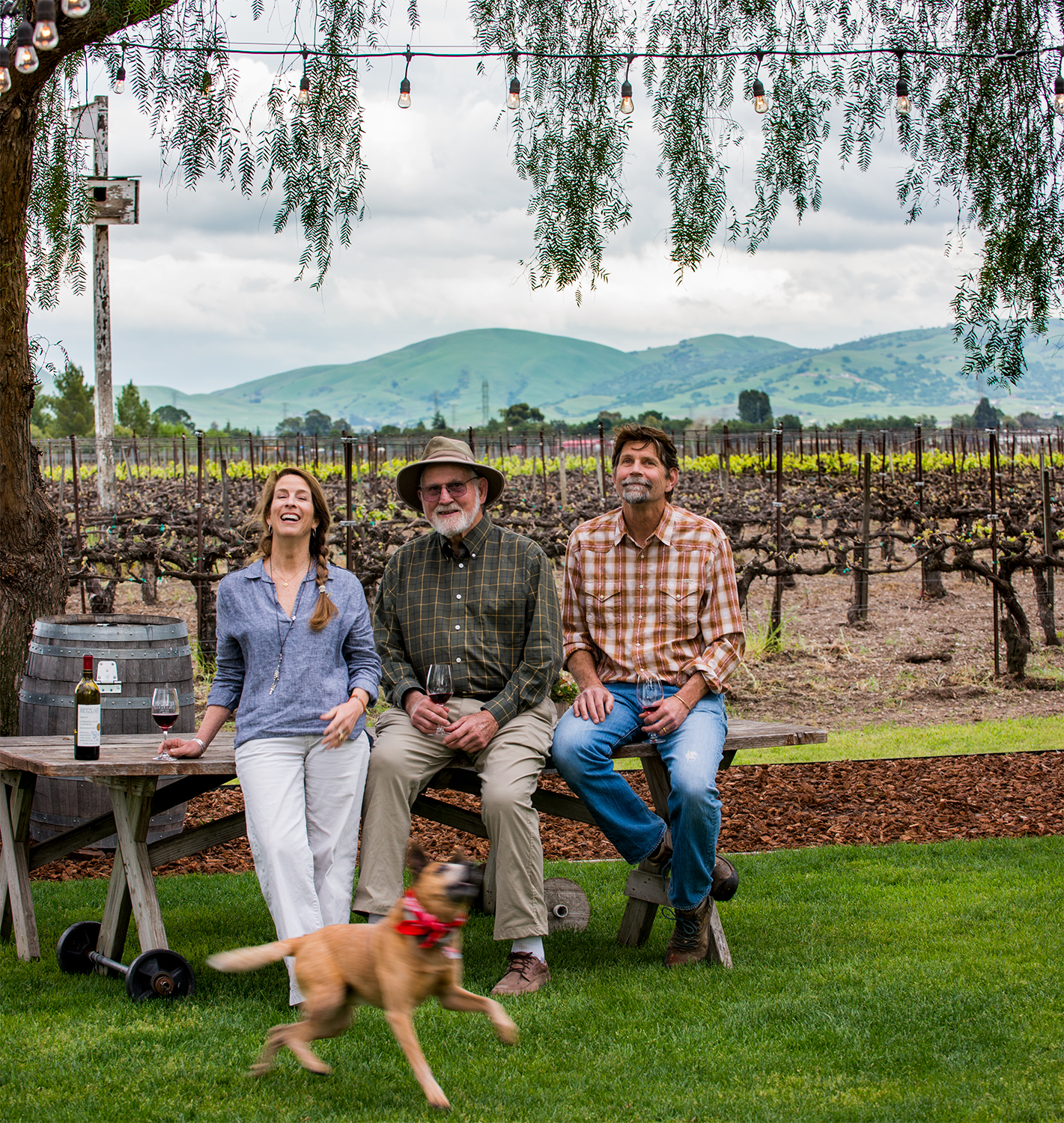 Gloria’s son Aaron (right), husband Bob (center), and daughter-in-law Salome Garau-Taylor toss the ball for Shadow on the tasting room green. Behind them is one of their certified-organic vineyards. Owls living in the owl box at left help keep rodent pests at bay. Photo by Scott Peterson