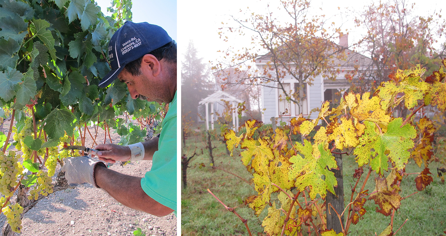 Vineyard manager José Hernandez has been commuting from Tracy to work at Retzlaff Vineyards for nearly two decades. It is he who makes the family’s philosophy of organic farming a reality as he works hard to keep a super-clean vineyard. Prior to joining the Retzlaff team, José spent nearly 20 years at Wente Vineyards developing skills and experience in all aspects of vineyard operations as well as much of the winemaking process. He uses no herbicides, pesticides, or fertilizers, and he spends considerable time experimenting with pruning techniques and canopy management. He believes that with less fruit, vines last longer (the Sauvignon Blanc vines on the property are over 40 years old). His theory is that a vine is capable of producing a fixed quantity of grapes over its lifetime, so he opts to prune for selective production to allow for a long lifespan. José is also a strong proponent of a pruning practice called “suckering,” in which unnecessary shoots are removed from the vine in order to redirect the vine’s energy toward only the most promising shoots. This results in fewer clusters of grapes with less leaf cover, allowing the grapes to more easily withstand the hot Livermore sun and develop appealingly ripe and concentrated flavors. “If you expose the grapes early,” Noah explains, “they acclimate and get a resistance to sunburn.” The exposure also helps to keep the grapes dry, allowing fresh air to circulate to combat mold and mildew.