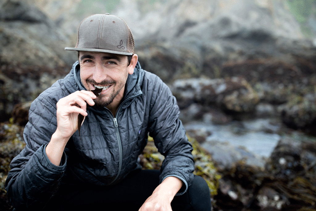 Ian O’Hollaren takes a bite of nori, a delicious and common seaweed that blankets the rocks in the intertidal zone.