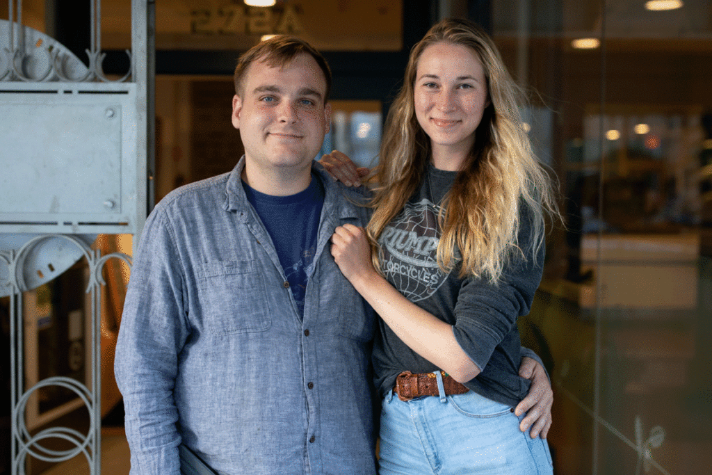 Austin Klein and Jessy Ryan, “co-flounders” of FreshCatch, stop for a moment at the Alice Collective door before an On the Hook dinner in April.