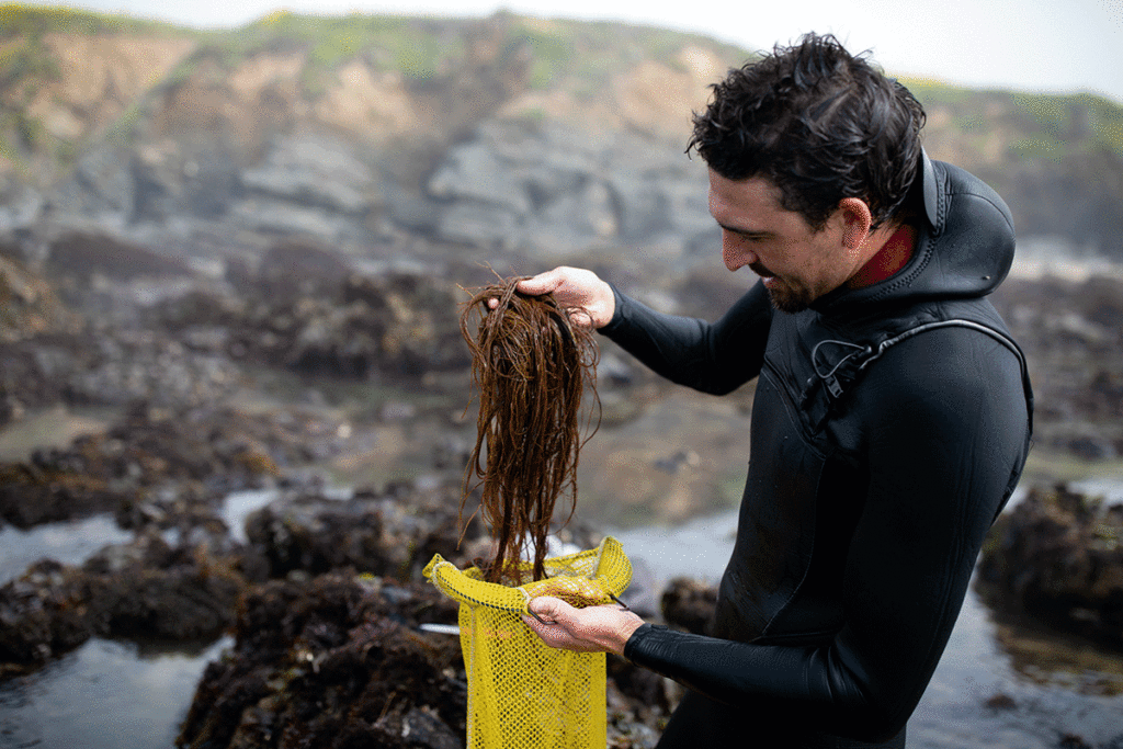 Ian O’Hollaren wades through the intertidal zone south of Half Moon Bay looking for the algae called “mermaid’s hair.” This deep-red, spaghetti-like seaweed, also known as “ogo,” can be eaten raw in soups or salads or boiled to make agar. O’Hollaren needs a few pounds of it to fill an order from Bay Area seafood distributor FreshCatch. Austin Klein, “co-flounder” at FreshCatch, plans to use it as a martini garnish.