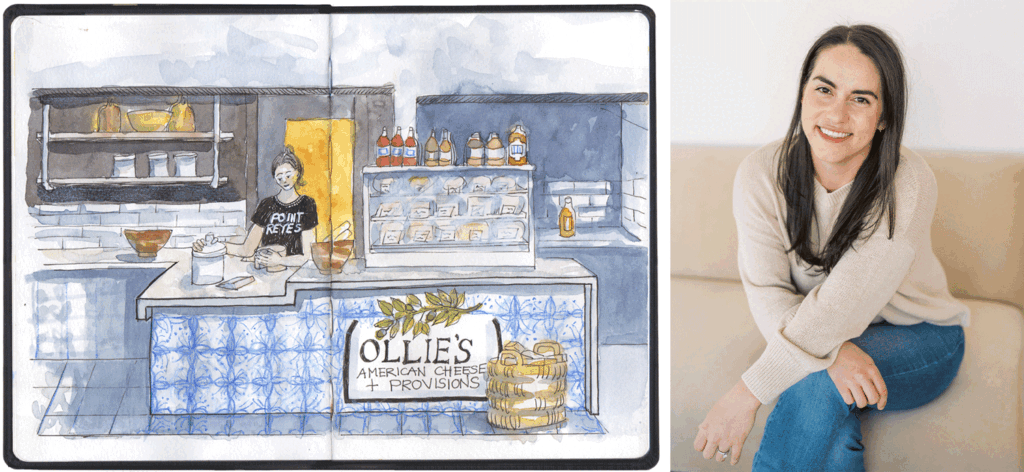 Alyssa Gilbert (right) is the owner of Ollie’s American Cheese + Provisions, a retail shop at 396 11th Street in Oakland. (Artist Cathy Raingarden visited and made the sketch at left). Gilbert is also the new executive director of the California Artisan Cheese Guild. Alameda Dragon Rouge Waterfront Vietnamese eatery offers exciting, inventive,…