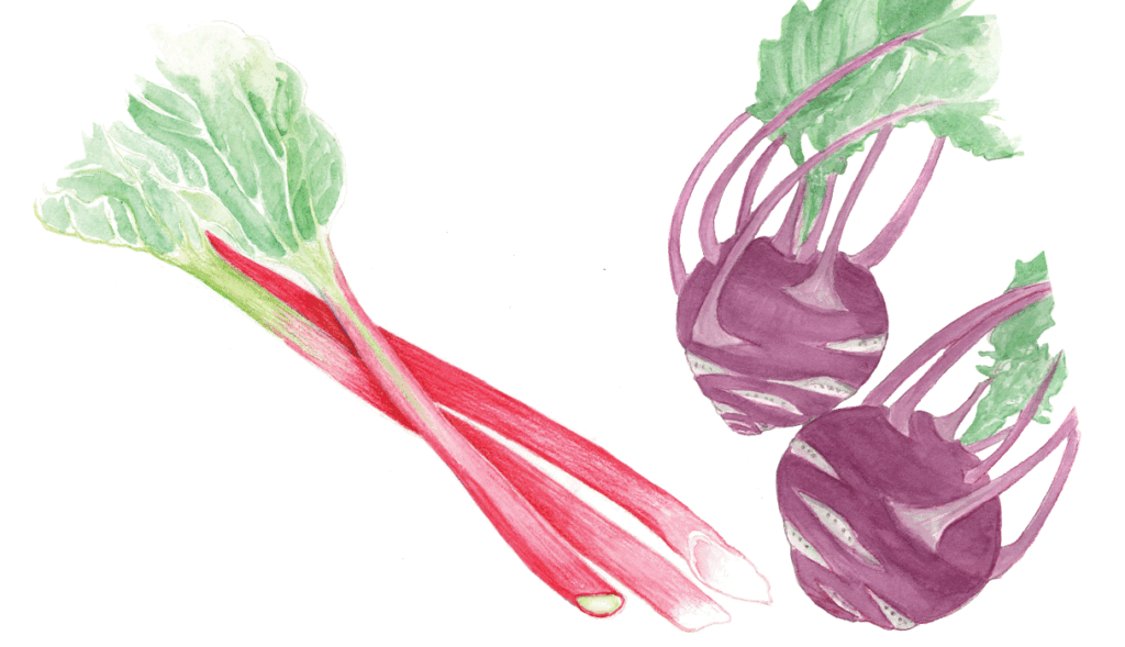By Barbara Kobsar | Illustrations by Charmaine Koehler-Lodge Want to add some unique vegetables to the weekly meal lineup? Kohlrabi and rhubarb (yes, it’s botanically a vegetable) are at the top of my list. KOHLRABI looks like a root, but it’s not. A native of Northern Europe, this globe-shaped member of the cabbage family…